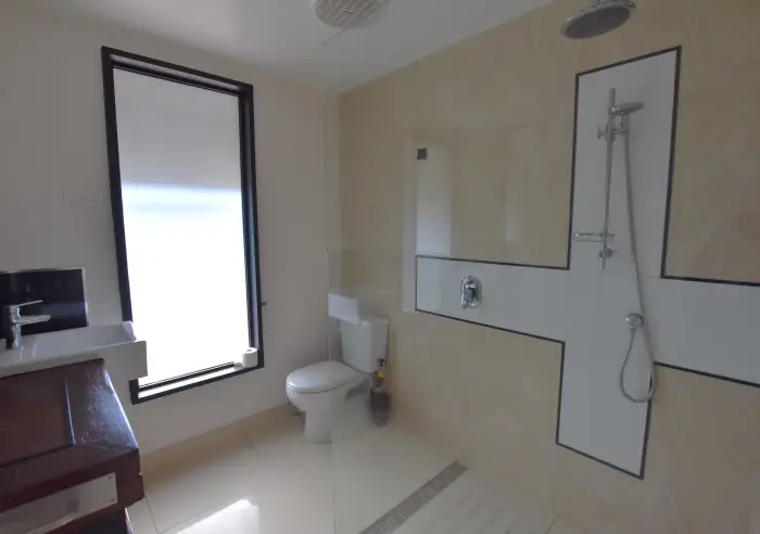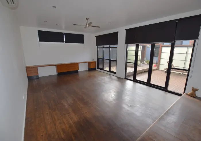 The bathroom is modern and spacious, featuring a large shower and toilet. The open plan living and dining area is light filled and connects easily to the courtyard, with a reverse cycle air conditioner to keep the home comfortable year round.
